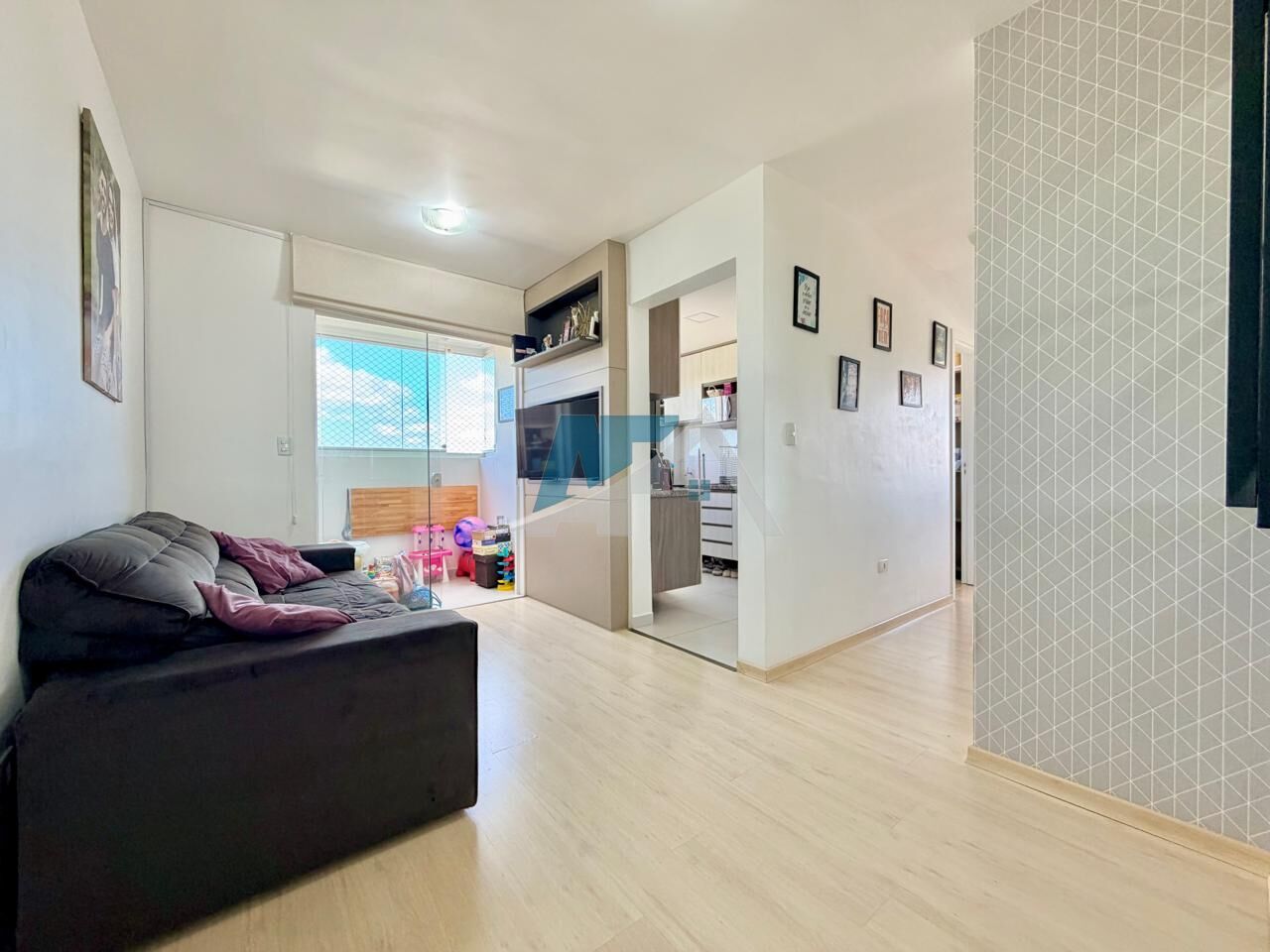 * Sala de estar aconchegante com painel para TV e sofá;